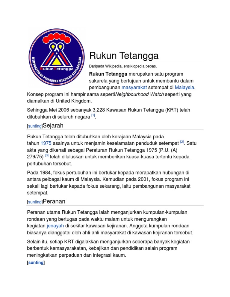 Apa Itu KRS. Konsep program ini hampir sama seperti Neighbourhood Watch seperti yang diamalkan di United Kingdom. Rukun Tetangga Dari Wikipedia Bahasa Melayu ensiklopedia bebas.